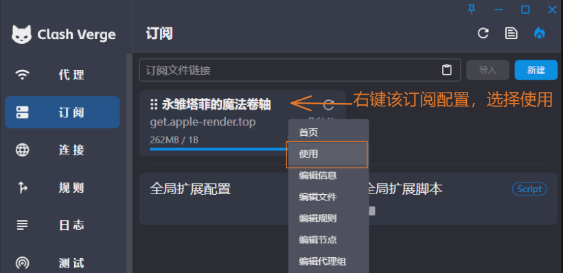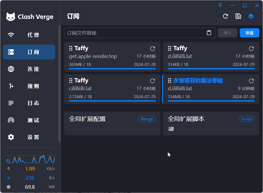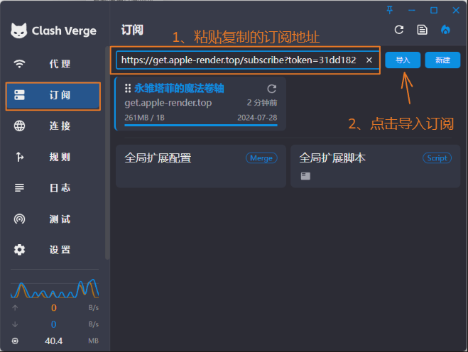 在 订阅 中,粘贴复制的订阅地址,并点击导入按钮