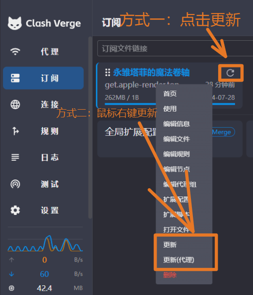 我们更推荐您右键选择更新(代理),它将会通过代理进行订阅更新,避免订阅链接无法访问,出现更新失败的情况。