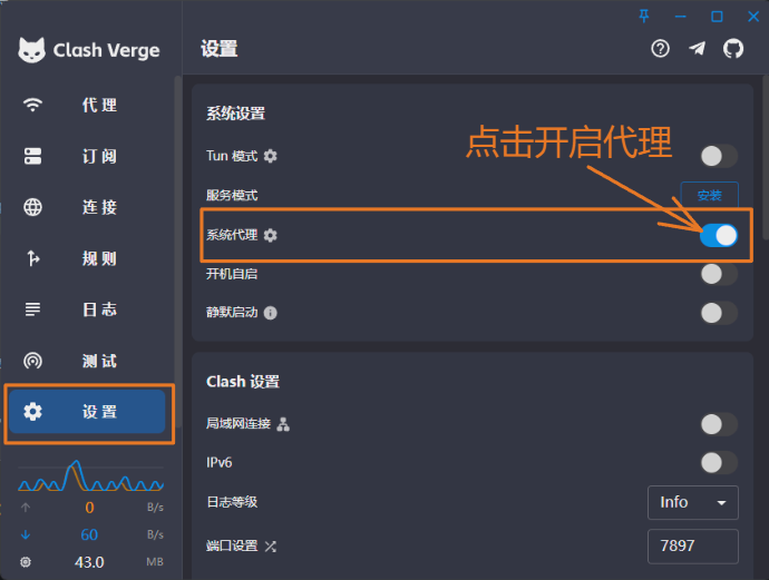 开启代理的方式很简单,Clash Verge软件切换到设置 开启系统代理开关即可。
