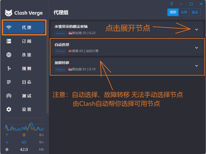 进入到代理界面,如果你需要手动选择节点或者切换不同地区的节点,请不要选择自动选择和故障转移里面的节点。