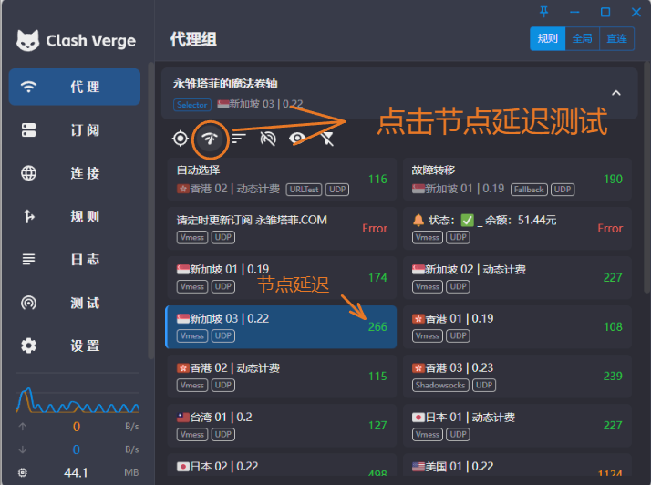 展开可以看到所有的节点,点击测试节点的延迟可用性