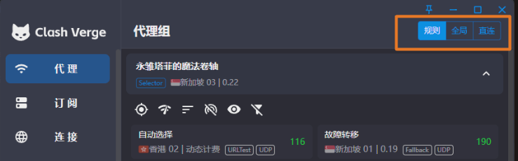 界面右上角可以看到不同的代理模式,点击即可切换: